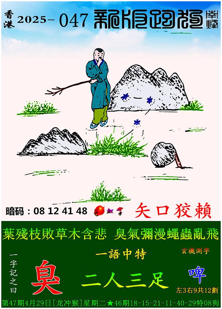 047期新版跑狗一字記之曰:【臭】 玄機測字:【啤】一語中特:二人三足